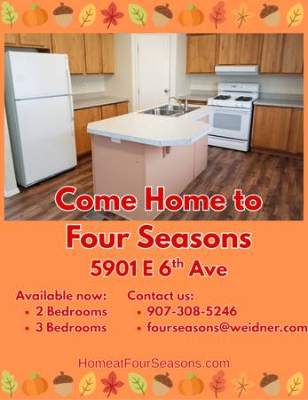 New 2 and 3 bedroom manufactured homes with 2 full bathrooms ready and waiting for you. Homes are approximately 1025 square feet of living space. Each home comes with granite counter tops in kitchen and baths. Enjoy taking advantage of your own full size washer and dryer! Four Seasons is a pet friendly community and we look forward to meeting your furry family members. The community is conveniently located close to Glenn Highway, military bases, shopping and entertainment.