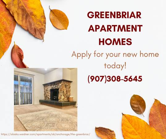 Spacious apartment homes offer comfortable living close to UAA, Providence Hospital, Alaska Native Medical Center, Elmendorf AFB, and Ft Richardson. The Greenbriar has nearby bike paths, a lake, parks, walking trails, restaurants, and easy access to Tudor Rd and a bus route. Select homes offer mountain views, balconies, fireplaces.