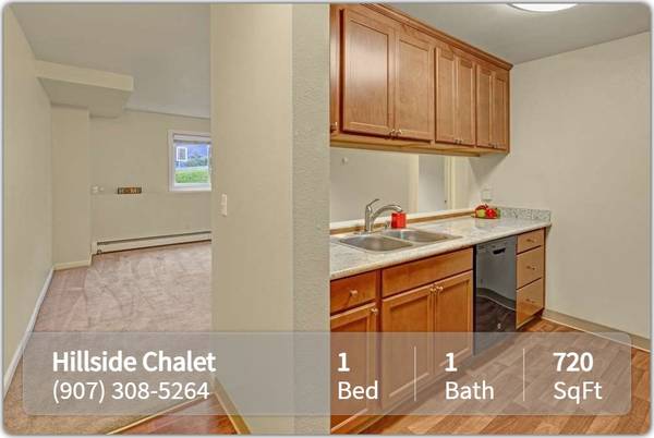 Within minutes of Downtown and Midtown Anchorage, Hillside Chalet offers quaint, Bavarian-style apartment homes with electric fireplaces and balconies for cozy convenience. Your pet-friendly apartment community also features on-site laundry and is a keyed accessed building.