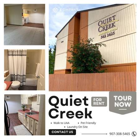 Quiet Creek Apartment Homes offers convenience, value and comfort. Beautiful one and two bedroom apartment homes with spacious kitchens and dining areas, in-building laundry facilities, controlled access entry, and a large yard nestled in the tree line of Campbell Park.