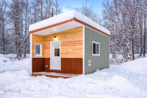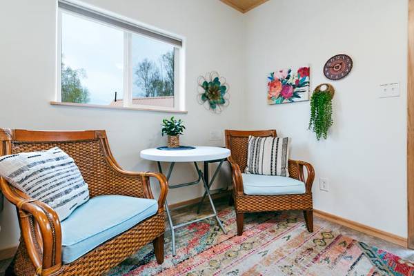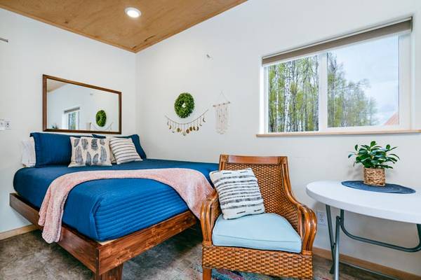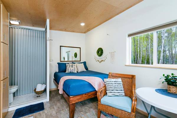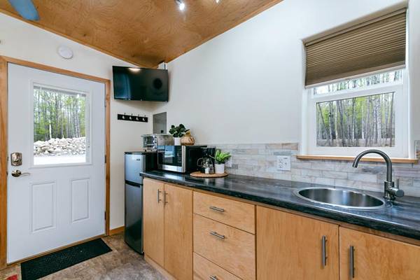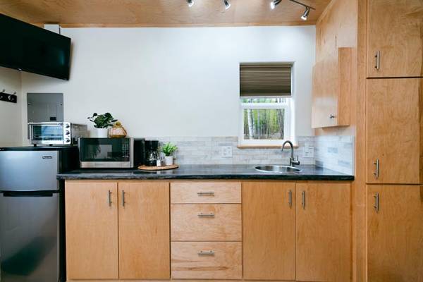 Make yourself at home in this gorgeous, furnished tiny house! It's 12'x16' with a platform queen bed (plenty of storage opportunity underneath!) The kitchen includes a microwave, refrigerator and freezer, toaster oven, electric double hot plate, as well as dishes and cookware. There is a table with chairs.