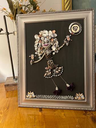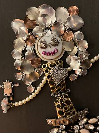 Really beautiful, fun piece of recycled, broken and vintage jewelry. I love Simone and her friends and her happy face dancing under the moon. She is made from bits and pieces I’ve found. Signed, ready to hang or sit on a table.
