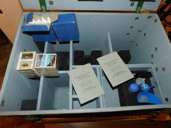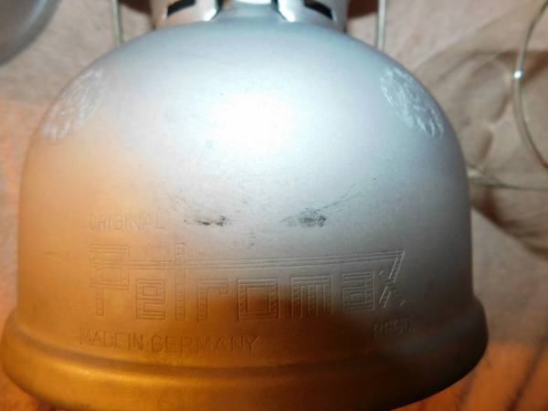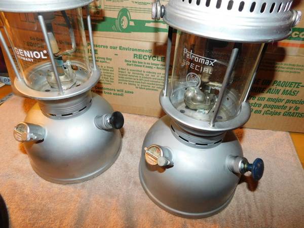I believe the Petromax Geniol set is from the late 1980's. There is a 1987 stamp inside the box. Instructions are NOT in English. Only one of the tanks is marked Petromax. The tank on the one with the Geniol globe and top is not marked. It does contain parts marked Petromax. Extra glass globe marked Schott Suprax glass. The set is not a complete. I believe it is a Swiss Military set. Very heavy set. With all the items, it weighs about 57 pounds.