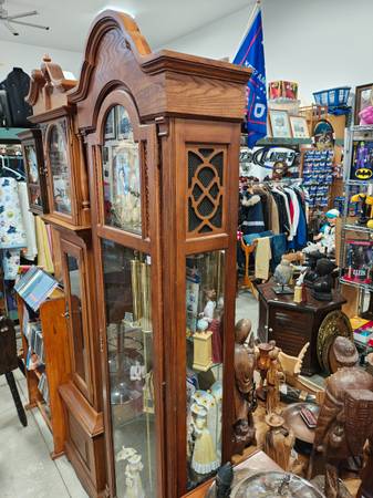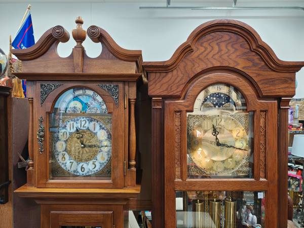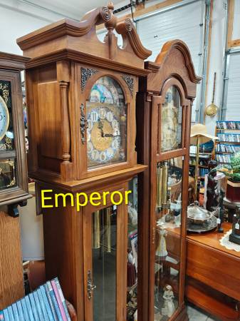 I have two beautiful grandfather clocks in excellent working condition. First is an Emperor measuring 19"x 12.5"x 83" tall and second a Ridgeway measuring 25"x 12"x 82" tall. Clocks are $900 each with delivery available for extra fee. Delivery includes setup. Call Mike 795-0795
