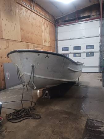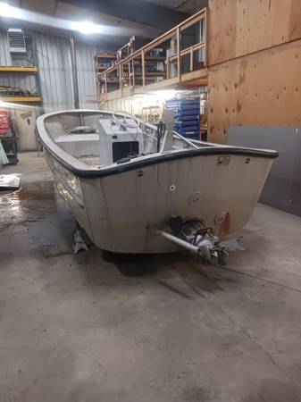 15' Aluminum Seine Skiff with 4 cylinder gas engine. Not sure of brand and it is not running. Would be good candidate for 4BT/Tractor conversion
