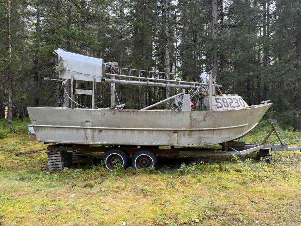 24' commercial fishing (salmon) shallow water purse seine jitney with 460 Ford engine. Built in 1989 by Ledford welder. Has TWO 75 gal aluminum tanks. Located in Seward, on a trailer. Ran when parked, has been sitting for a few years. Has a rope hauler-block, needs hatch covers. Hold is 10' wide x 7.5' long x 2' deep, self bailing. Could be modified for kelp farming / seaweed farming / aquaculture. Net and skiff are available separately. $25K OBO TEXT is best Alaska area code 575 ONE 66 ZERO