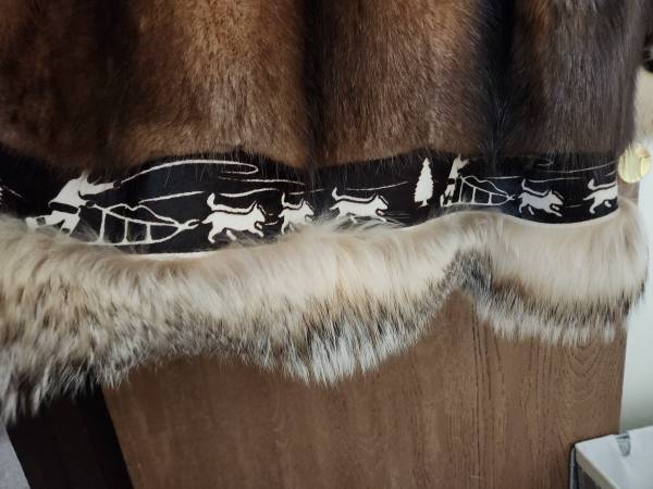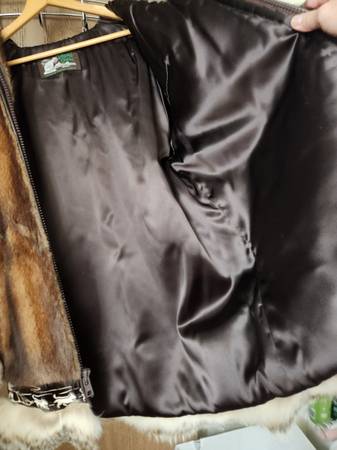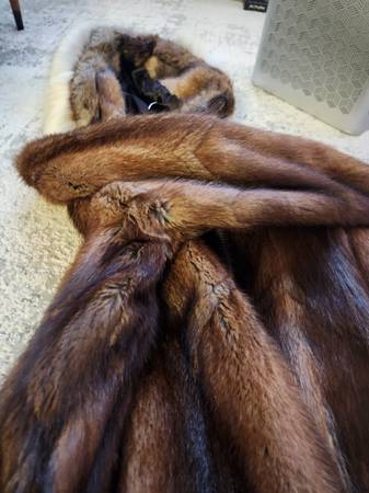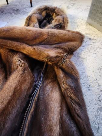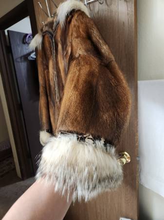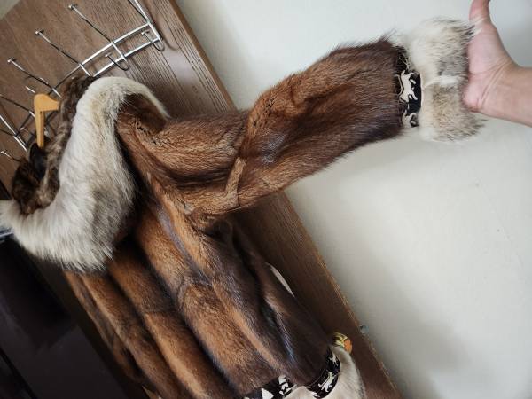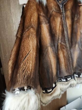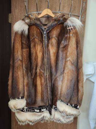 like new muskrat--NOT beaver-- parka by david green furrier. NO rips/tears, wolf ruff and trim. Lining in excellent condition. Stored indoors in zippered garment bag, in smoke free home. Size XL...