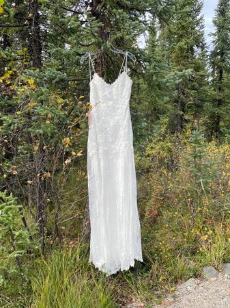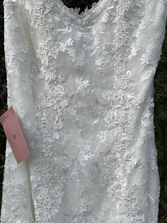 This is a brand new, tags still on, beautiful wedding dress by BHLDN. I bought it online to try it on side by side with a different dress, and ended up going with the other one. It is overall lacy and gauzy, with a fitted bodice and a flowy bottom.
