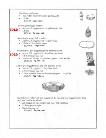PRIVATE PARTY - Custom Alaskan gold nugget jewelry, appraisal was obtained when gold price was $3,262 troy ounce. Semi Hoop Earrings. $650 Natural Gold Nugget Link Bracelet. $1500.00 Lady’s Gold...