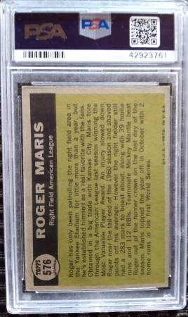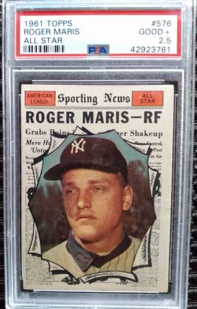 I've got a 1961 Topps #576 Roger Maris All Star baseball card professionally graded as a PSA 2.5 (good plus). The card depicts the Hall of Famer in his New York Yankee uniform. Cash Only.