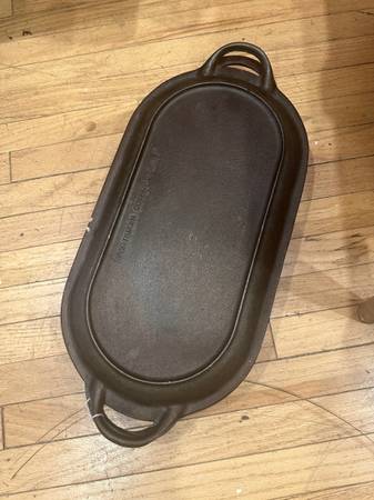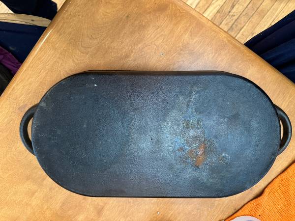 Cash only, I do not ship. Lid is snug. Inches: 20.4w x 9.5w x 2h (without lid), 3h (with lid in place) Birmingham Stove and Range, in great shape.