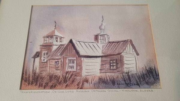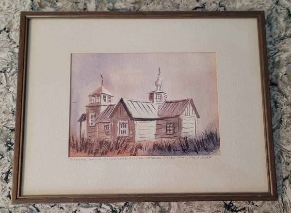 Original Watercolor, ready to hang, by Sam McClain. Titled "Transfiguration of our Lord Russian Orthodox Chapel- Ninilchik, Alaska". Not sure on date but framing looks vintage. Great for the Alaskan history buff or that eclectic place in your life! Give as a gift or enjoy yourself. First come first served, cash please.