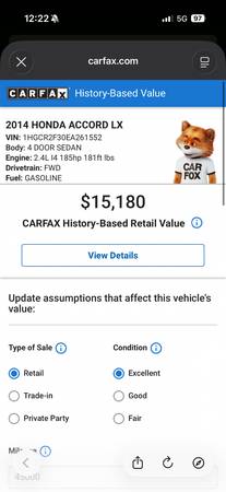 I’m selling a 2014 Honda Accord LX, only has 45,000 original miles, clean title, 4cyl, excellent condition and well maintained vehicle, comes with summer / winter tires and drone auto start. Asking...