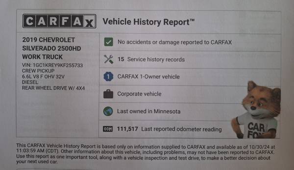 READY TO WORK OR PLAY. ZERO ISSUES. COMPLETELY STOCK NEVER BEEN TUNED. I AM THE 2nd OWNER. THE 1st WAS A HVAC CONTRACTOR IN THE BURBS OF MINNEAPOLIS. SERVICED AT THE CHEVY DEALER AS THE CARFAX I RAN B/4 I PURCHASED SHOWS. I HAVE THE REPORT IN HAND. I PURCHASED THIS BEAST FOR THE SOUL PURPOSE TO MOVE FROM MINNESOTA TO ALASKA PULLING A 24' LONG, 10' TALL ENCLOSED TRAILER WHICH WAS NOT ANY KIND OF CHALLENGE FOR THE BEAST. I AM A RETIRED TRUCK DRIVER AND KNOW LOAD VS POWER. THIS TRUCK WITH THE L5P ENGINE HAS MORE POWER THAN IT IS RATED FOR LOAD WEIGHT. THE HVAC OWNER DID NOT PULL ANYTHING MORE THAN A SINGLE AXLE TRAILER THAT HAD A TRENCHER ON IT. IT DID HAVE WESTERN PLOW MOUNTS ON IT THAT WHERE REMOVED AND USED JUST FOR HIS DRIVEWAY. HE SET UP ALL OF HIS TRUCKS LIKE THAT BUT ONLY HAD 1 PLOW. THAT IS WHY THE COWLING UNDER THE FRONT BUMPER IS CUT OUT. IT HAS A FEW DENTS AND LOTS OF DINGS. IF IT WAS A PERFECT BODY I WOULD BE AT $45000. I CHANGED GEAR LUBE IN BOTH DIFFS WITH AMSOIL SEVERE GEAR. TRANSFER CASE WITH AMSOIL SIG ATF. TRANSMISSION BOTH FILTERS AND INSTALLED CASTROL TRANSYND 668 WHICH IS SPECIALY MADE FOR ALLISON TRANYS. FRONT BRAKES AND ROTORS AT 111500. REAR BRAKES AND ROTORS AT 115000. NEW FIRESTONE DESTINATION XT TIRES (3 MOUNTAIN PEAK RATED) AND ALIGNMENT AT 115000. MANY OTHER MAINTENANCE ITEMS I HAVE RECORDS FOR. TOO MUCH TO LIST. I RUN AMSOIL SIG 6X IN ENGINE WHICH WAS CHANGED AT 120250. PICS TELL THE STORY. SOLD THE TRAILER AND NO LONGER NEED A DIESEL. ***TEXTING AND EMAILS WILL BE COMPLETELY IGNORED***. CALL ME AND LEAVE A MESSAGE AND I WILL GET BACK TO YOU PROMPTLY. I STILL HAVE A MN AREA CODE. LOCATED 1 MILE FROM SETTLERS BAY LODGE DOWN THE KGB. SORRY ABOUT THAT.