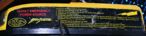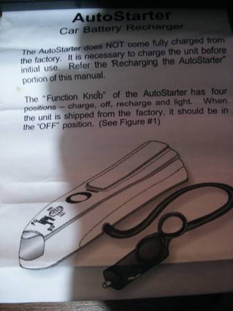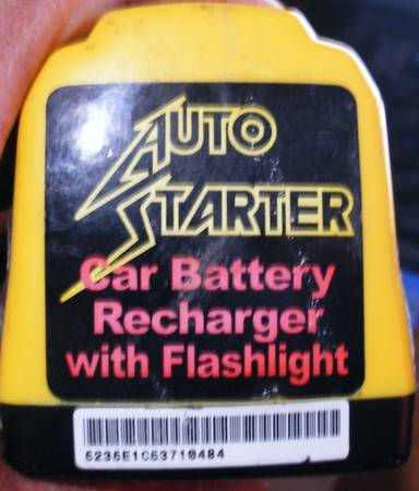 AutoStarter Car Battery Charger with Flashlight. The cable plugs into the vehicle auxiliary plug. Call Al at . (No texting)