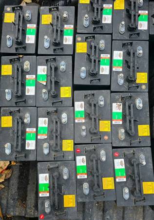 Bank of 16, GC2 210Ah (@20 Hrs) @ 24v equal to 840AH or 20.16KWh in storage! Half of the batteries are new as of 2025, and the other half of the bank are relatively new, purchased 2022. I describe the battery bank as “Relatively New” because even though some are dated 2022, these batteries were a bank which was attached to my rental cabin battery bank. These batteries have had very few cycles, and they were only used for 2 seasons (6 months total). Each rental season is only 3 months of light usage. The batteries were used lightly, only to power LED lights inside of the cabins. The bank was stored through winter in the heated main house, with a battery maintainer/trickle charger keeping the bank topped up while in storage. On the 1st of each month, I religiously check and add distilled water to all of my batteries. These batteries have never been used with low water. In fact, they each have only taken a few oz of water because of the light usage, and low cycles. These batteries have never been drawn lower than 90% depth of charge and have never had a high amperage draw.