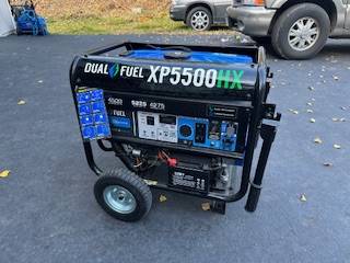 For sale, Duromax dual fuel XP5500HX portable generator and 40 ft cord. Runs on gasoline (5,500 peak watts/4,500 running watts) or propane (5,225 peak watts/4,275 running watts). Generator has an easy push-button electric start and runs great with low hours. Generator has a 120/240V 30 A twist lock receptacle, a standard 120V 20 A GFCI duplex receptacle, and a USB charging port for portable electronic devices. Gas tank has a 4-gallon capacity with a run time of 19 hours at 25% load and 9 hours at 50% load on gasoline.