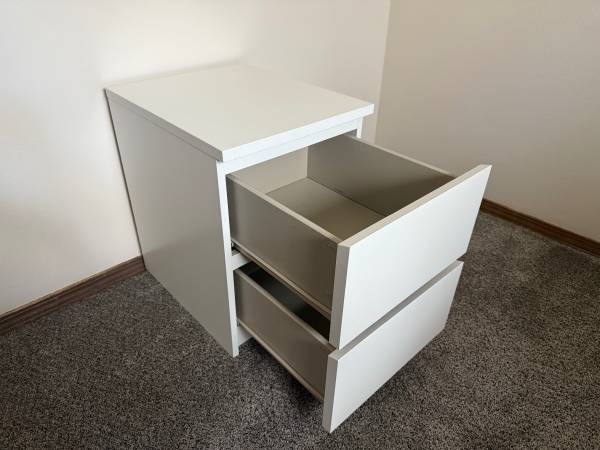 White, Ikea MALM nightstand/ end table. Two drawer, excellent condition. 15 3/4"wide x 21 5/8" high x 18 7/8" deep.