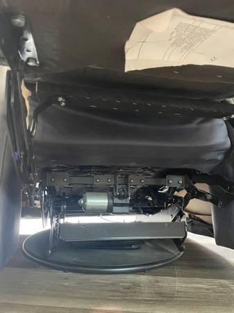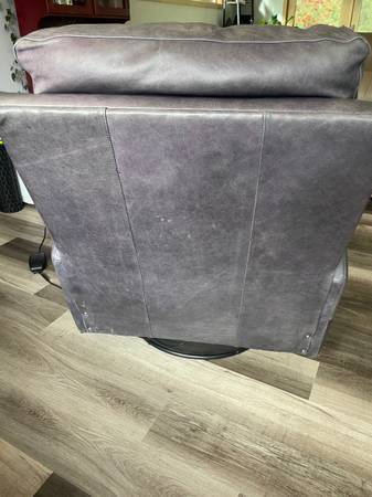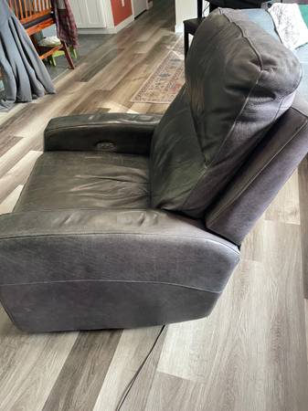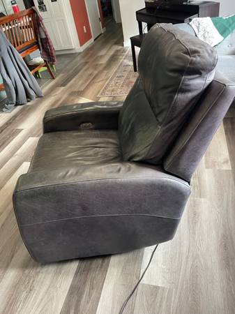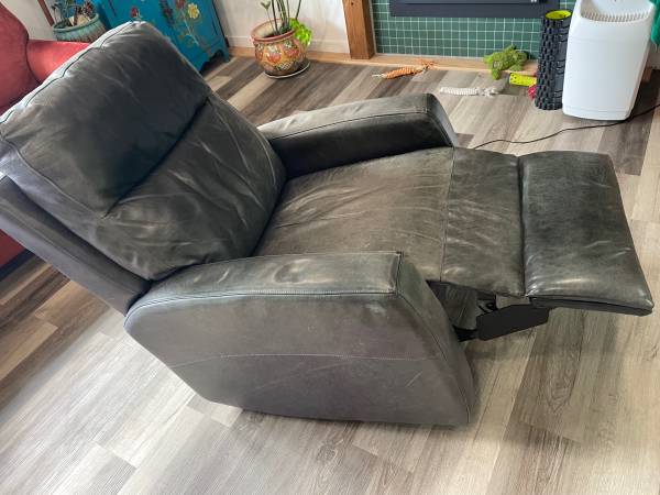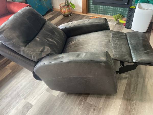 Leather recliner. Muted blue in color. Made in America. Older but fully functional. 32 wide x 41 tall. No rips or tears, leather has a couple dips on the armrests-see photographs. Not right for our...
