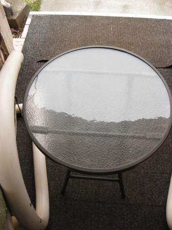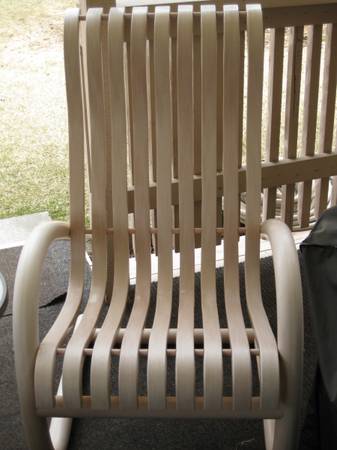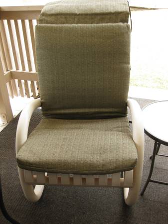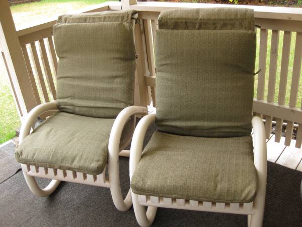 2 Patio Rocking Chairs with Cushions and Glass Top Side Table, the chairs are made of some type fiber or resin that allows them to flex and rock. In great shape 100.00 call 279-4806