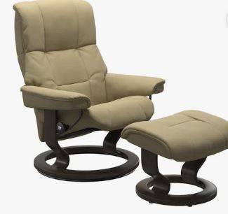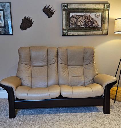 Like New: Ekornes Stressless Mayfair - High Back Loveseat in special Paloma Sand Leather with Wenge colored wood. Love seat retails for $4500.00 new. In addition, two Ekornes Stressless Large "Mayfair" Sand Leather Swivel Recliner Chair & Ottoman (Made in Norway) Can be purchased together ($2500.00) or separately; love seat $2000.00 and two chairs $1000.00. From smoke-free, child free, and pet free home.