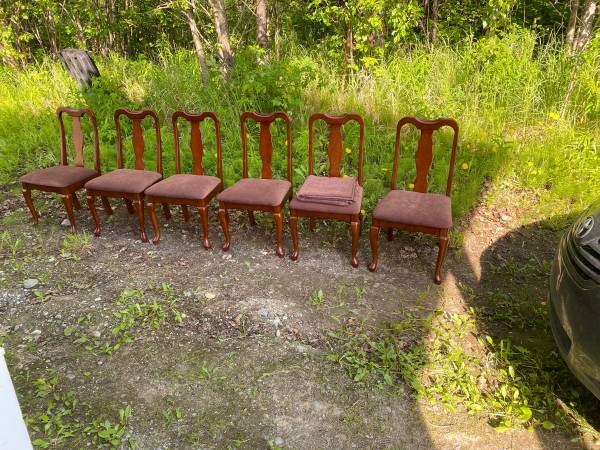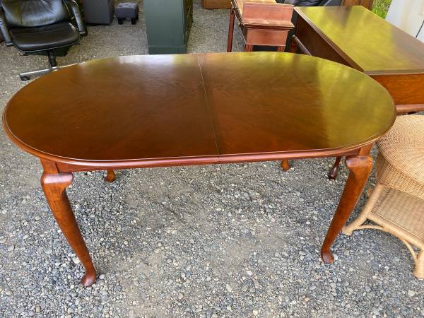 Oval dining room table with leaf and six chairs with upholstered seats in very good condition