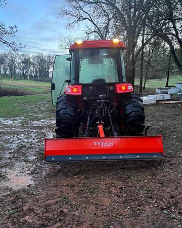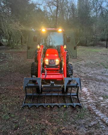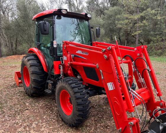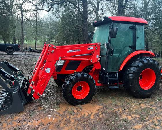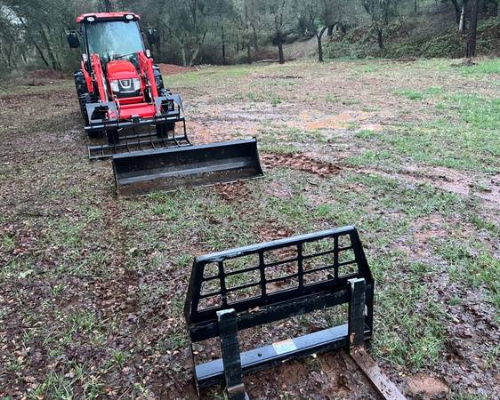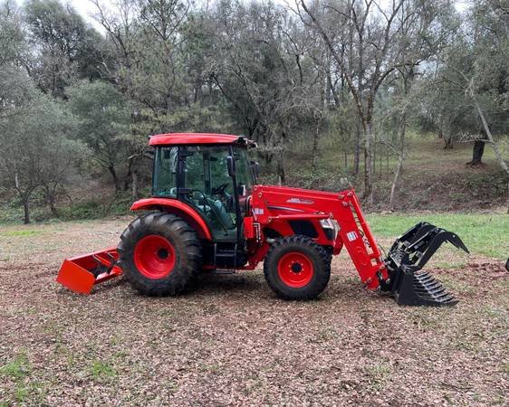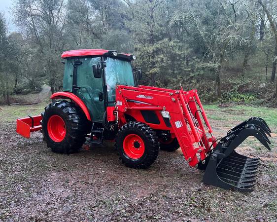 Comes with an 84" bucket, a 72" grapple bucket, heavy Tarter forks, and a box scraper. Tractor has joystick controls, a 3-point hitch, and auxiliary hydraulics.
