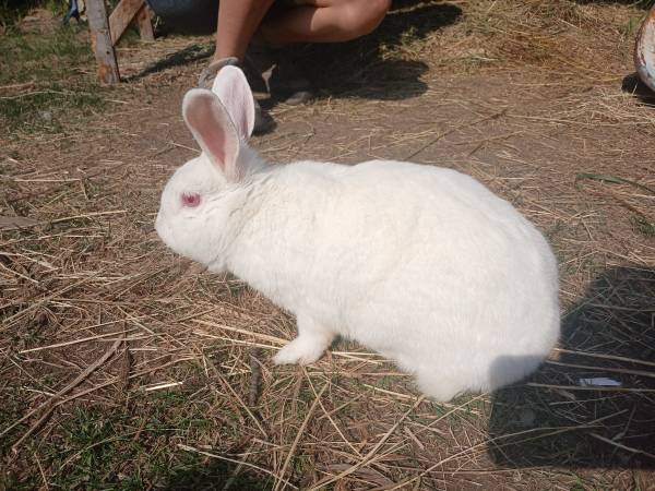 1/2 New Zealand White (doe pictured), 1/2 Satin mix (buck pictured)