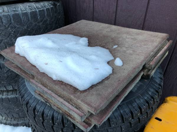 Used interlocking rubberized floor mat tiles for garage or workshop. No damage, but are dirty/stained. Each tile measures 2FT square x 2" thick and weighs 23lbs. These tiles provide good cushion/ergonomics for standing areas. 2 black tiles and 2 brown tiles for sale. Asking $20 for all four.