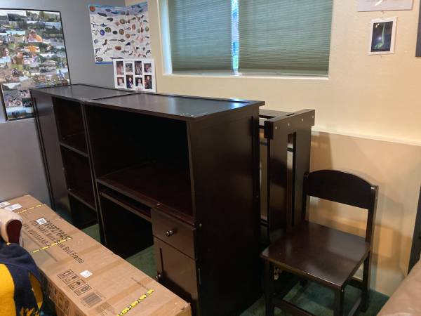 top bed frame, storage and book shelf, desk, bottom frame (in box). Comes with desk chair