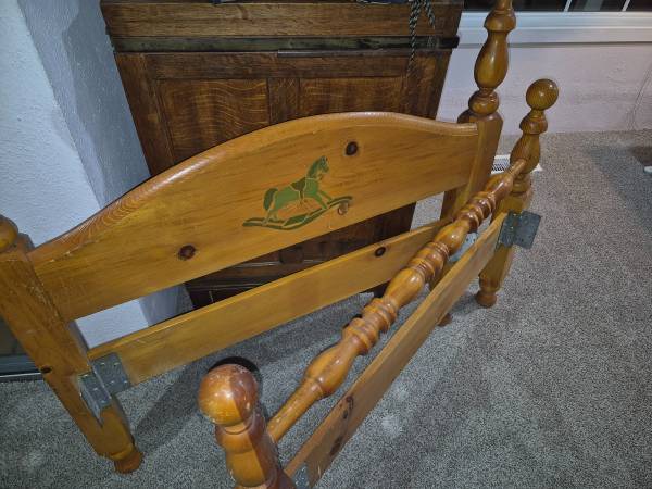 In ready to install condition. No mattress Must see , good condition. Pine wood.