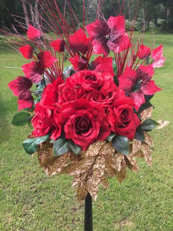Beautiful Floral stand to accent your home. Red/ black w/ bronze glitter leaves 50 inches tall - 20 inches wide.