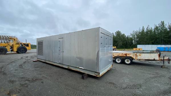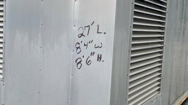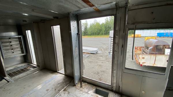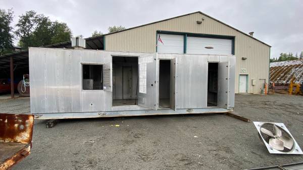 Insulated storage container Connex it is 27 foot long by 8 foot four wide by 8 foot six high built on a steel channel with Steel support for the flooring. Wall ceiling flooring is insulated modular panel build. It has several openings hinged Doors of various size sizes largest bin 3‘ x 6 eight several that are 2 foot wide . It was built to house a natural gas fired furnace for heating construction work. Comes with one pallet of the miscellaneous aluminum panels and exclusion. Have a forklift to load it on site in Kenai.