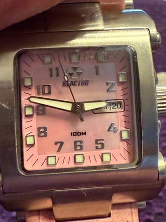 Ladies reactor watches in pink mother of pearl and purple mother of pearl, retail new was$650.00 asking $100 Reactor was built to the highest standards,316 L stainless steel hardened ceramic glass. Waterproof resistant to 100 meters and even if the crown is not screwed down still water resistant. A great addition to any watch collection