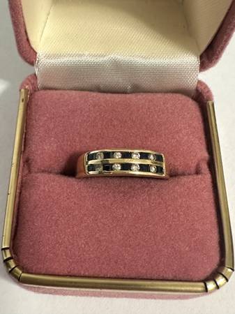 A very lovely ring with 10 rectangle sapphires and 8 round diamonds. It is stamped 14k but I can't get a picture of it that comes out clear. There are some small scratches on the gold, but nothing deep or very noticeable.