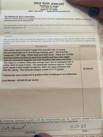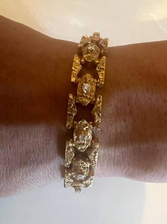 10kt yellow gold and gold nugget link bracelet with round, full-cut diamonds set in four-prong settings each. 7-3/8" long, 11mm wide and 4mm thick. There are 13 links that have three sections to each link (see complete text on appraisal - appraisal is over 7,800 USD). Also, ever since the appraisal the gold market price increased significantly. Subsequently, bracelet would be worth even more. Cash only.