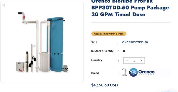 Orenco Biotube Propak pump package for timed dose. System includes pump vault, pump, filter, floats, and control box. Used for lift station to pump effluent to septic field. Removed in good working order to install Advantex system. System was in use for approximately 6-7 years before removal and was regularly maintained. This system currently retails for $4,200. Selling for $1250 OBO.