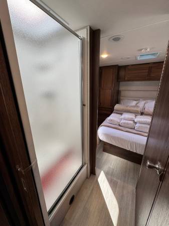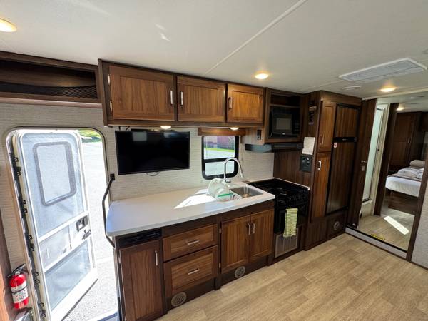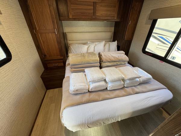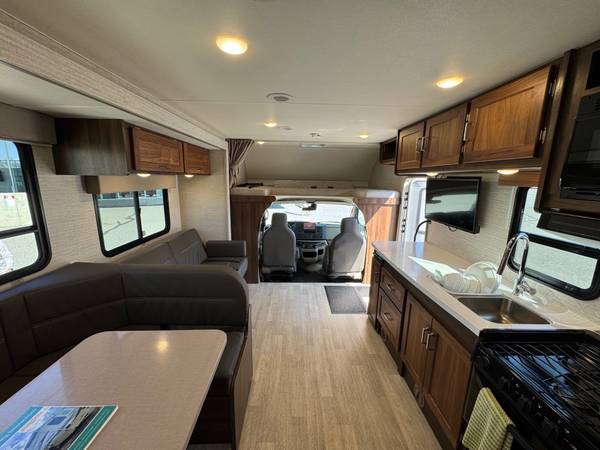 The 2023 Winnebago Minnie Winnie 31K super slide floorplan offers an expansive and luxurious living experience on the road, making it an ideal choice for families and groups seeking both comfort and style. The standout feature of this Class C motorhome is the large super slide that extends along the entire length of the living and dining area, significantly increasing the interior space. This slide-out creates a roomy environment, allowing for a spacious U-shaped dinette and a comfortable sofa, both of which can be converted into additional sleeping areas. The rear bedroom features a queen-sized bed and ample wardrobe storage, ensuring you have a private and restful retreat after a day of adventure.
