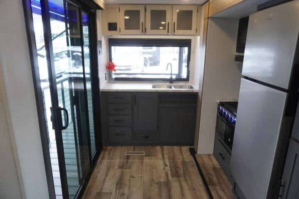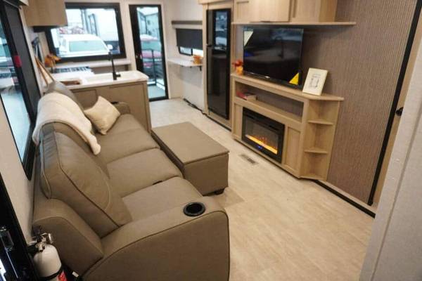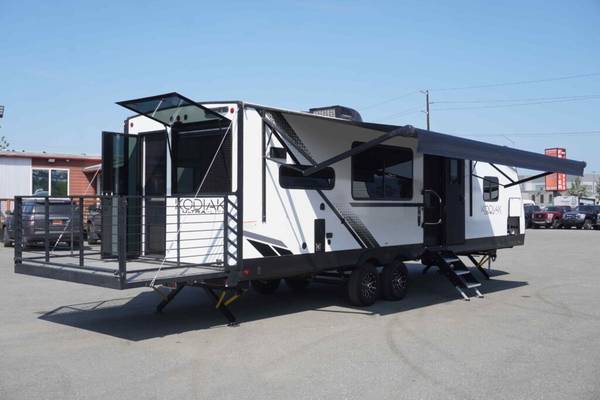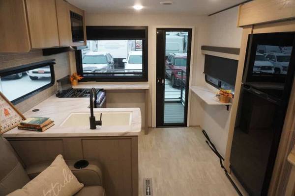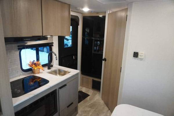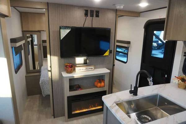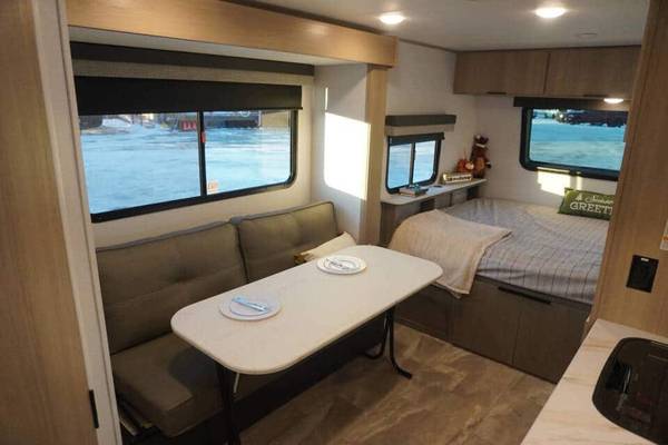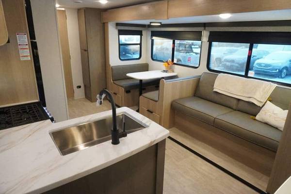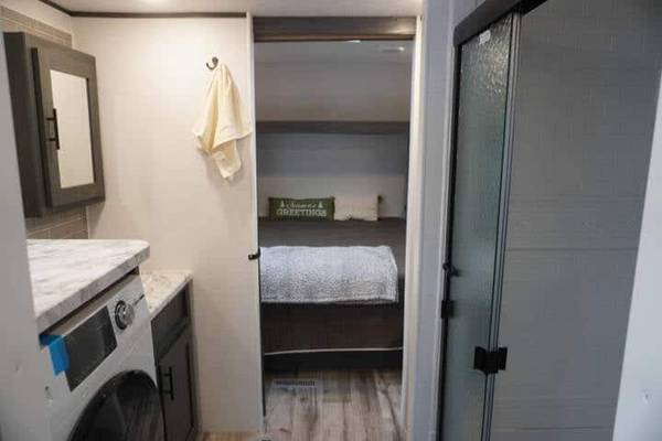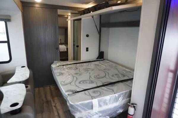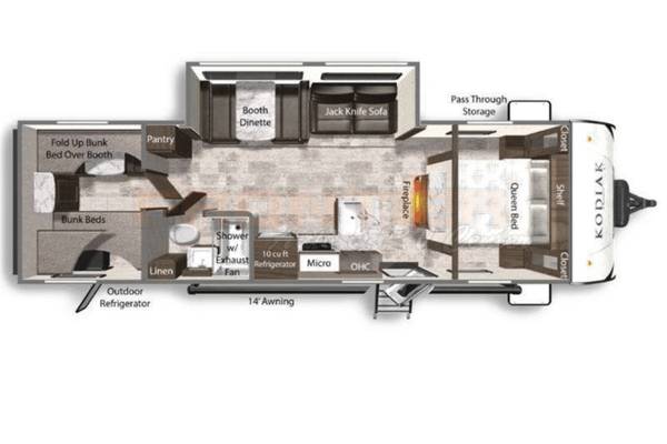 This cozy travel trailer will be perfect for weekend stays at the campground! You will have a front queen bed to sleep on instead of on the floor or an air mattress, and the full bath is a luxury you won't want to camp without. After you've whipped up breakfast on the two burner cooktop or in the microwave oven, you can dine at the jackknife sofa with an indoor/outdoor table. This model also includes a 10 cu. ft. refrigerator and pantry for food storage!