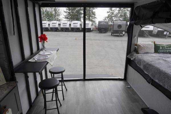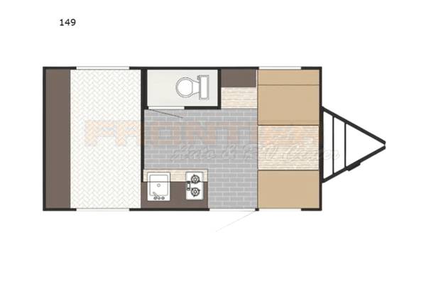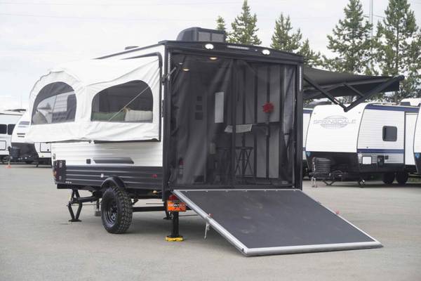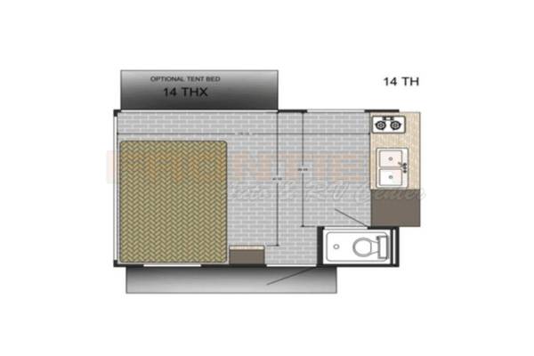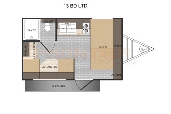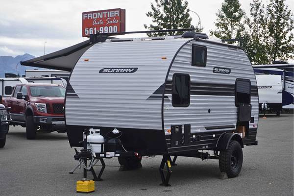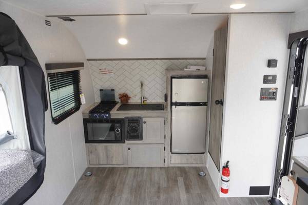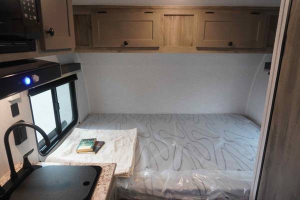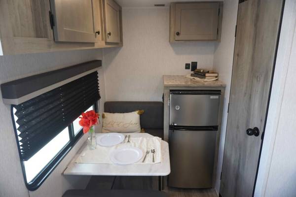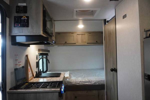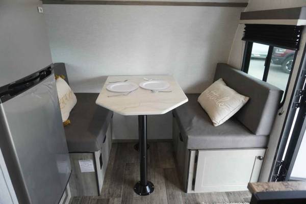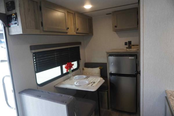 This lightweight travel trailer is perfect for two to three campers each night! You will sleep soundly on the front 54" x 74" bed with an overhead shelf and a closet for your things. Whip up eggs and bacon on the two burner cooktop in the morning, then dine at the 30" booth dinette. This can also double as sleeping space for an overnight guest or two little ones! The private bath with a 24" x 32" shower and a toilet will let you freshen up each day, and the double sink in the kitchen provides a place to wash your hands and teeth at night. You will also appreciate having a 4.3 cu. ft. 12V refrigerator to keep your food fresh and a 5K BTU wall A/C to keep you comfortable all summer long!