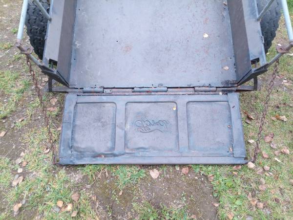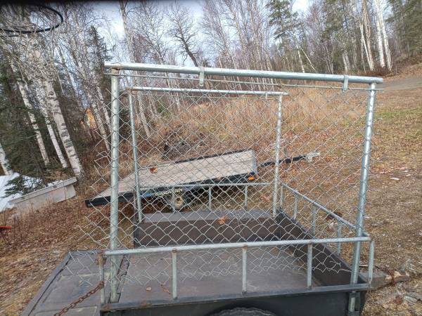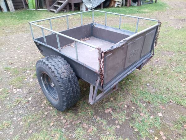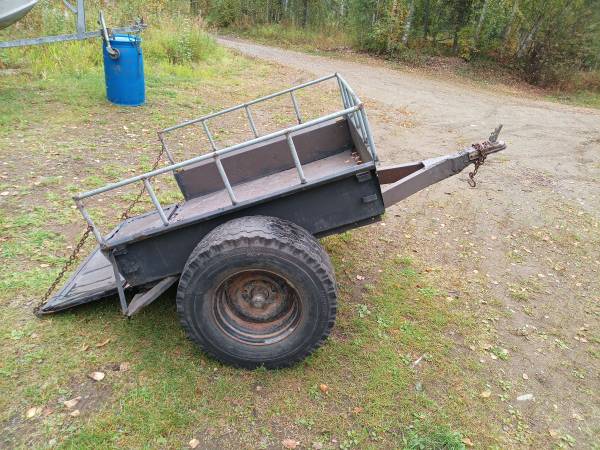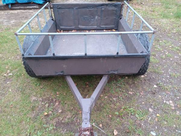 4'x4' trailer, big tires, 2" hitch. It's not the best looking trailer but it towes surprisingly smooth. It's light enough to move it around the yard empty by hand but it'll handle 2,000 lbs no...