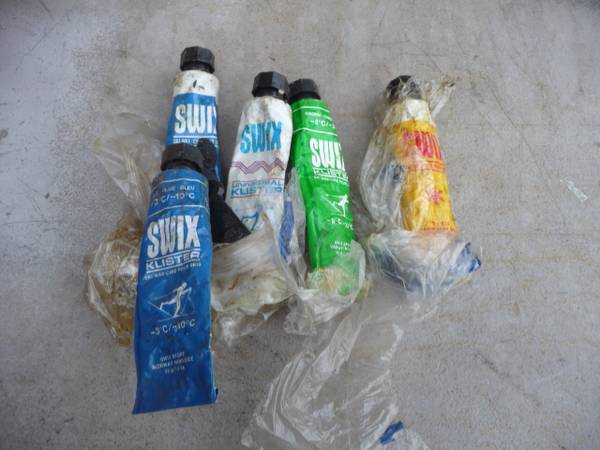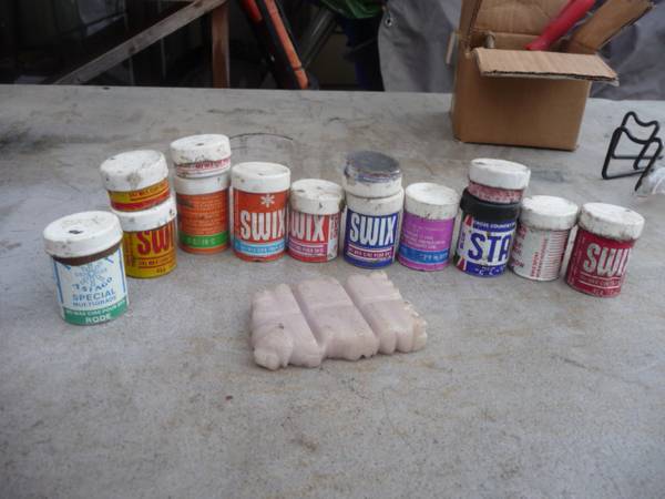 XC wax- about a dozen hard waxes for various temperatures. Mostly XC but I think there is some skate wax too, plus a bunch of Klister... not all are shown in the photo.