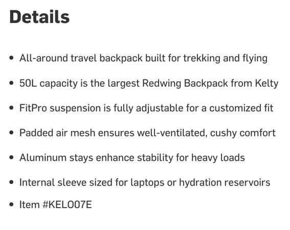 50 liter backpacking bag. Aluminum frame, mesh panels for air flow. Details in pictures from kelty website. Great condition, no stains or damage that I could see.