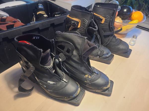 Inexpensive entry to try out the sport of cross country skiing. These accommodate the 3-pin binding style. Both sets of boots have undergone repair but are functional. They are size 46 (like 11.5 to 12.0). Make an offer or maybe a six-pack.