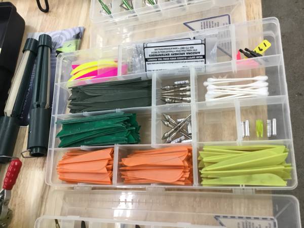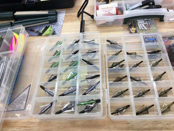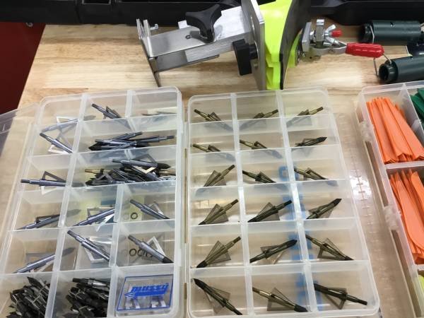 About 100 broad heads fixed and mechanical 100gr-125 gr.(about $1000 in heads alone making this a great deal)Fletching equipment.Pins.Biscuit rest.Field bow press.Slings.More.Throwing in accessories for wood arrows.Calls only 863-1155