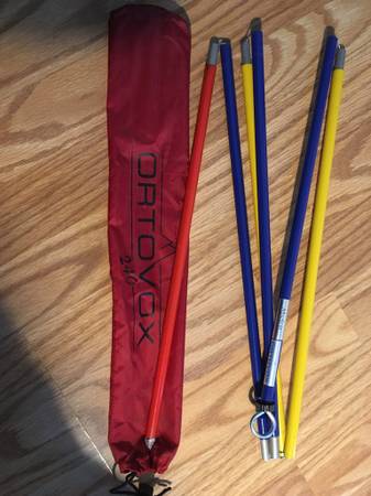 Older model collapseable probe pole. Happily, never used for real, only practice! Does not 'self assemble' like the new ones of today; with practice you can get it together and ready for probing in about 5-7 seconds longer than the new ones. Still in original transport sack and an essential backcountry skiing tool that happens to be affordable for you! I can bring to town if needed.