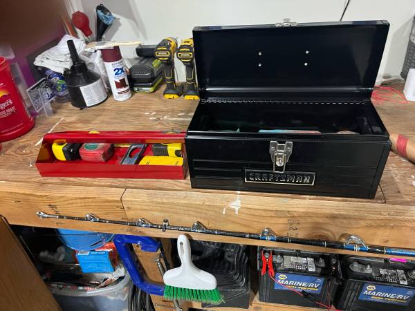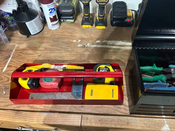 Toolbox with assorted tools. Carpenter's calculator, channel locks, tape measures, level, tin snips, screw drivers, drywall saws etc. $50 obo. Located down KGB in Wasilla. Cash only.