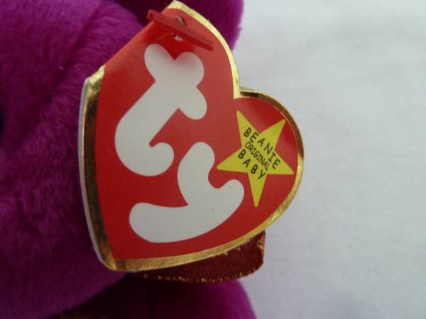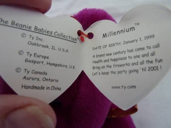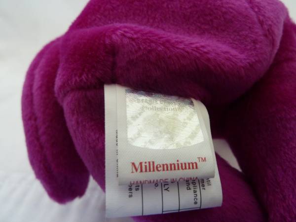Millennium is a fuchsia-colored bear with black button eyes and a larger black nose. He wears a golden colored ribbon tied around his neck and he has the Earth with the sun coming up from behind it embroidered on his chest with the number “2000” embroidered underneath. Protective acrylic case included.