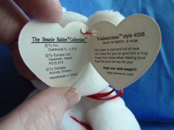 Valentino the Bear Valentino is a white bear with black button eyes and a larger brown button nose. He has a red ribbon tied around his neck and an embroidered red love heart on his chest....