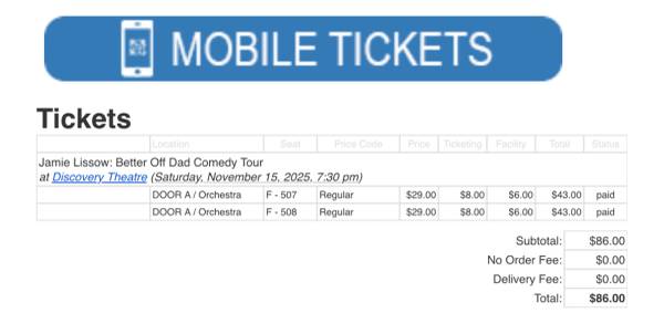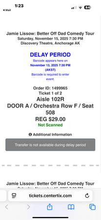 2 second row from stage door A orchestra Aisle 102R Seats F 507-508 on isle for easy in/out and close to stage. Plans changed can’t attend; selling for less than the ticket cost see image of ticket receipt. Tickets can be transferred on the 13th at 7:30 pm. See images of tickets.